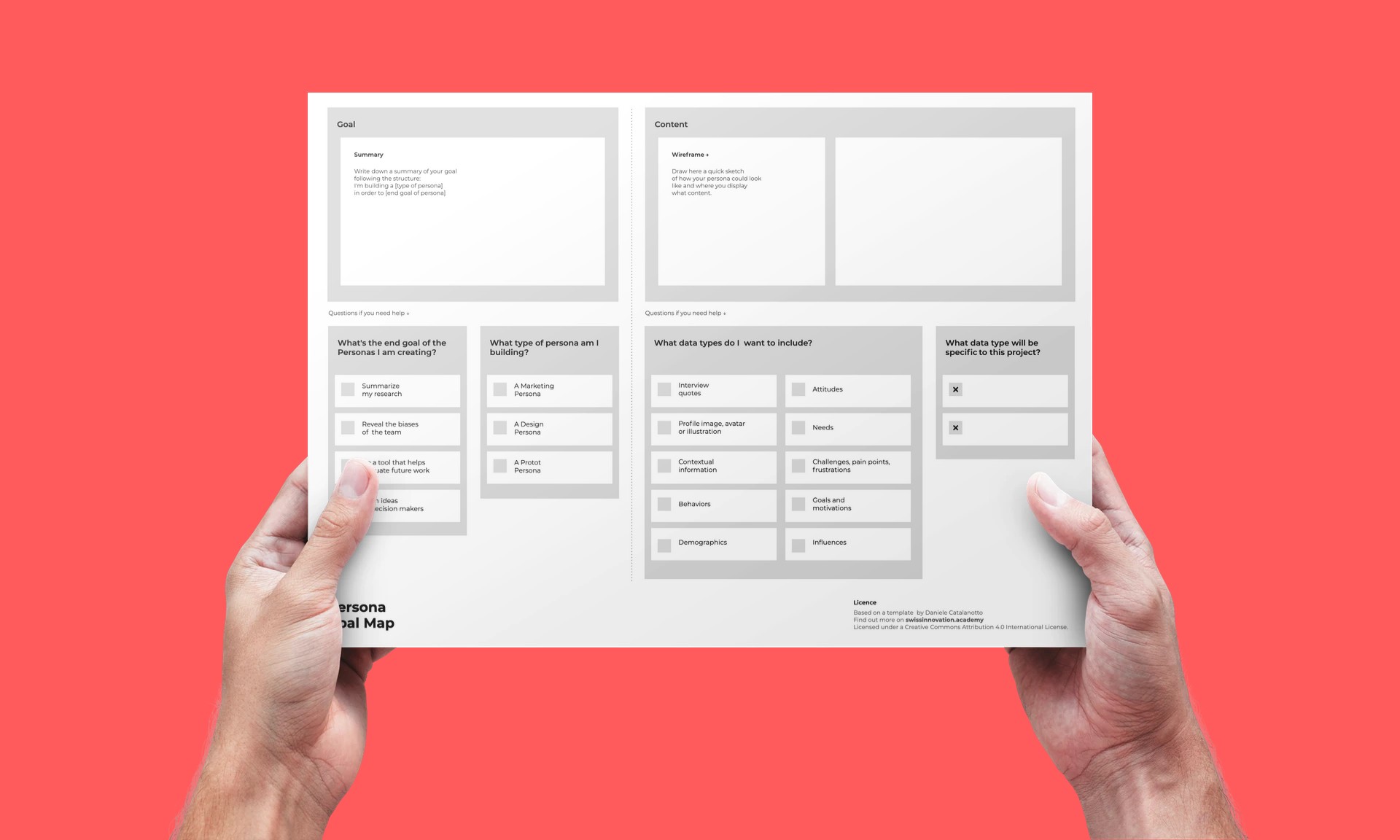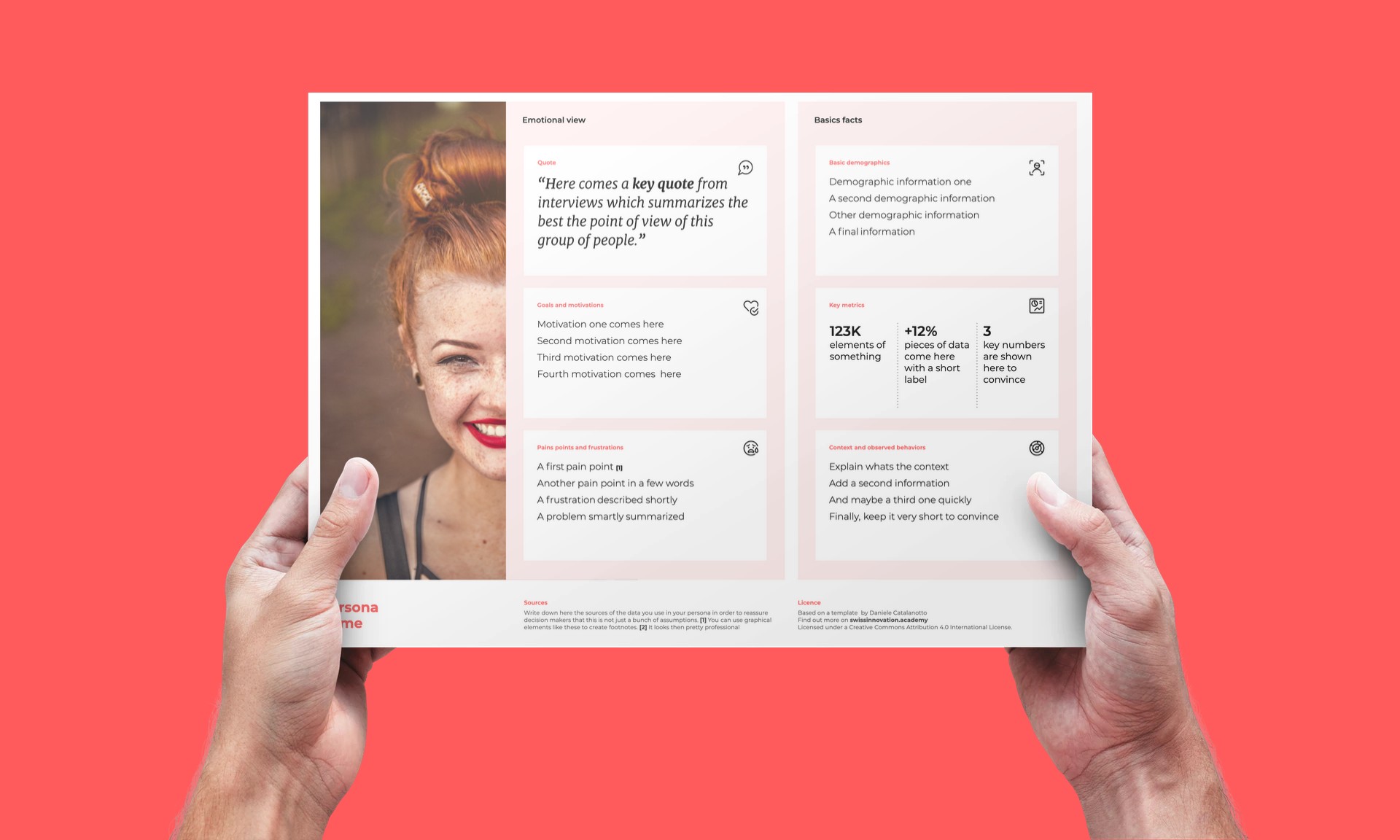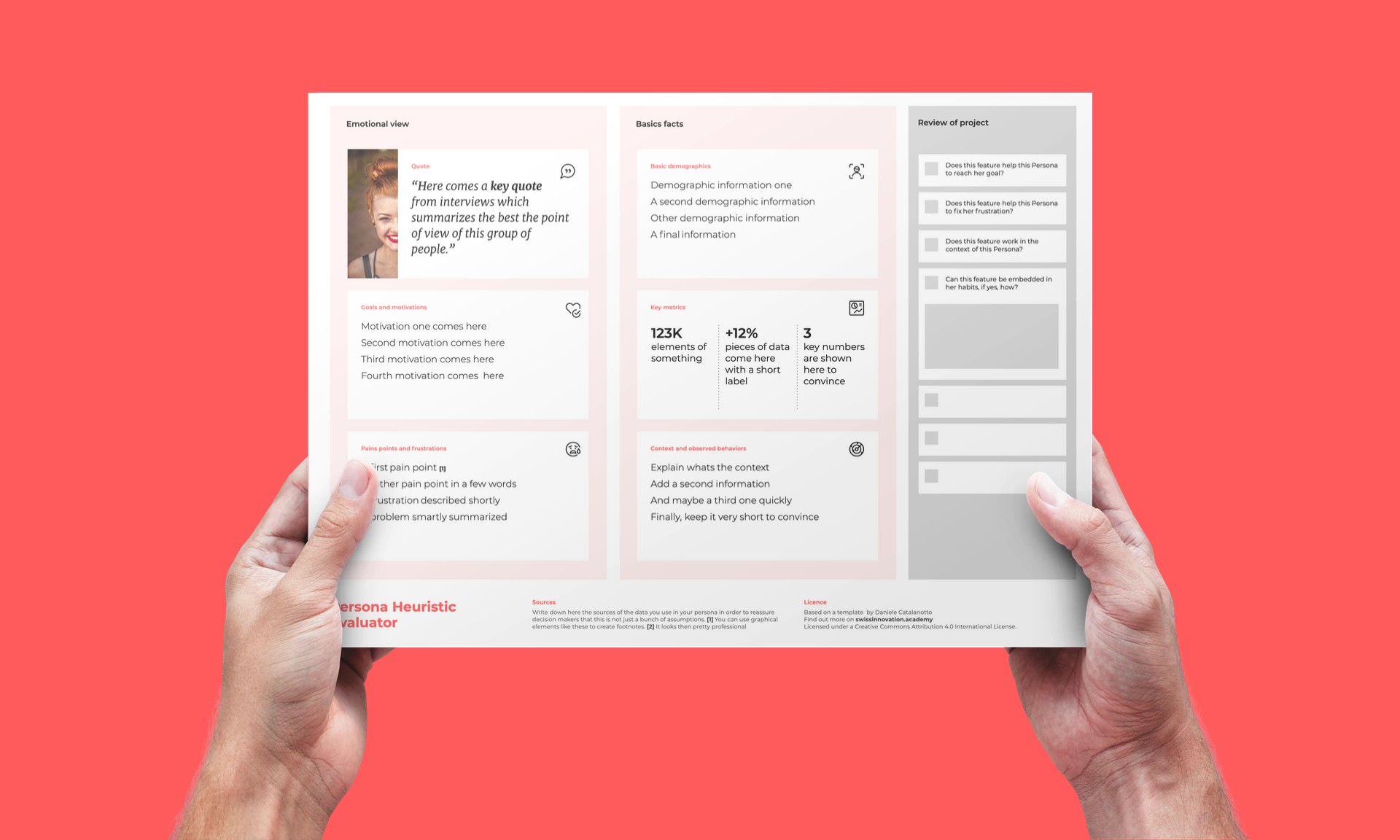 This fully editable template allows you to design a persona and have right next to it evaluation questions that you can use as checkins during your next innovation or design project.