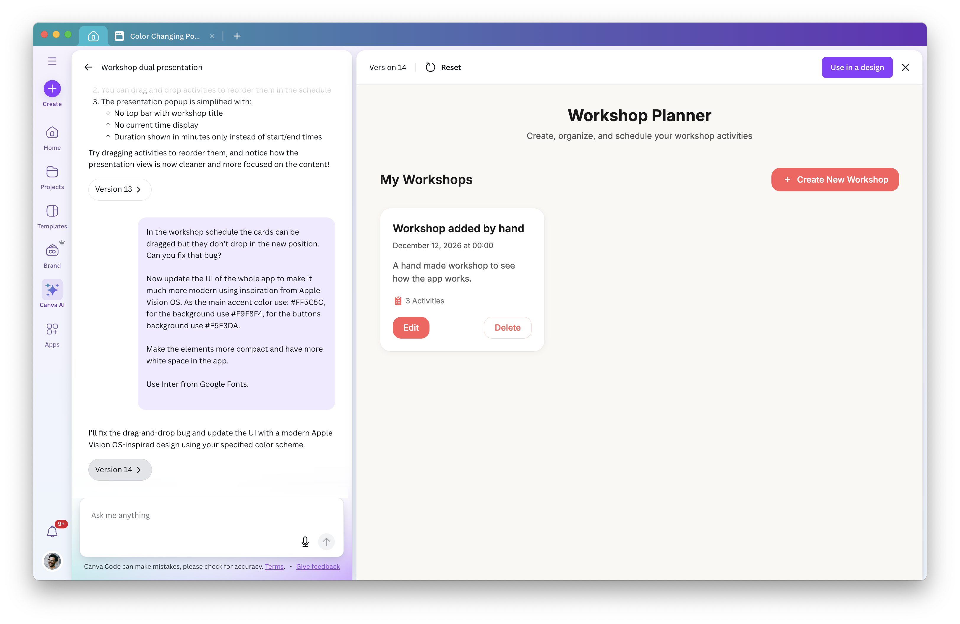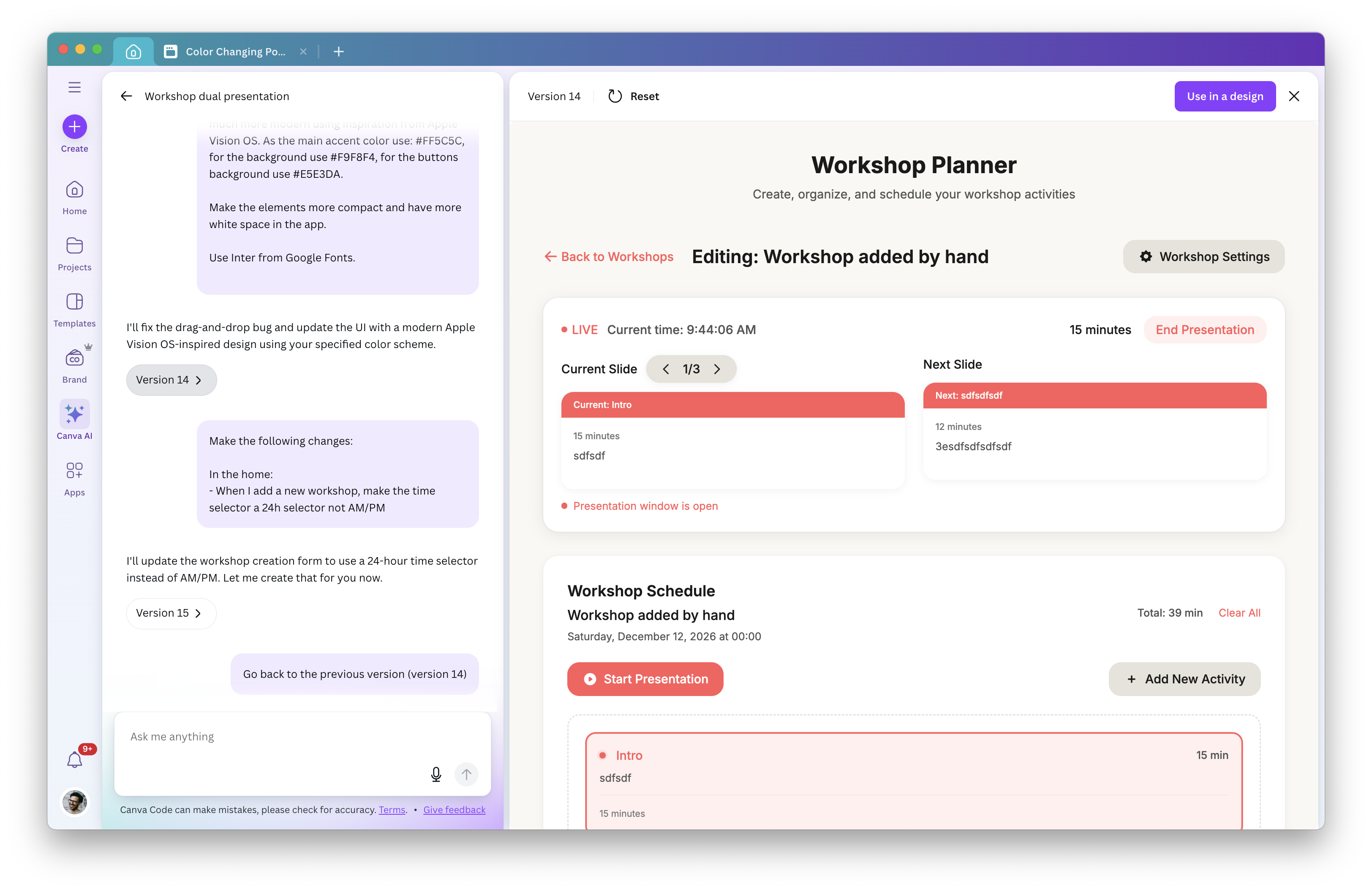 A view of the home of the workshop planner after I asked Canva Code to fix the time format.