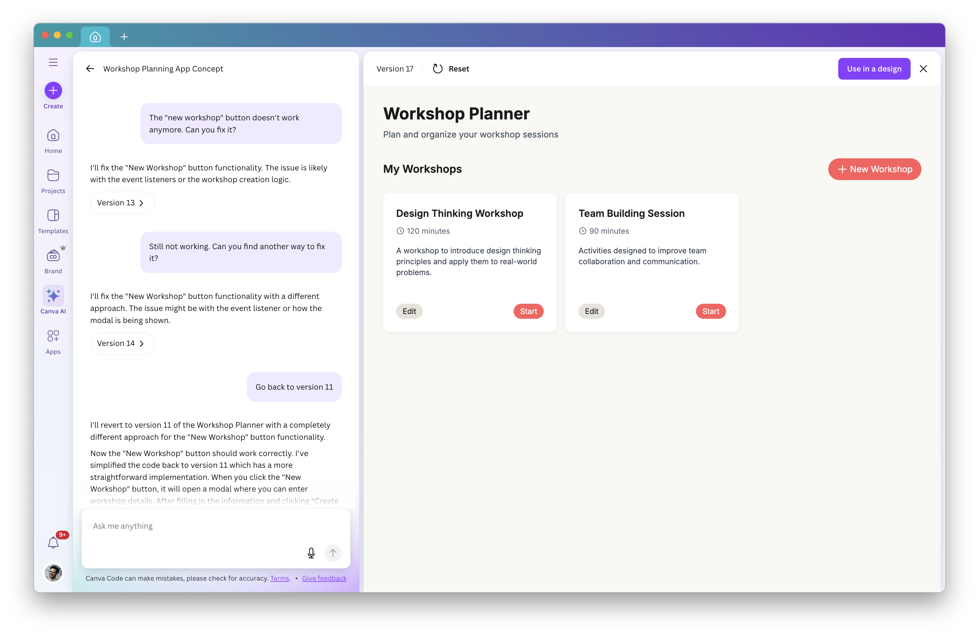 The one big issue I have with Canva Code at the moment is that there is no way to revert back to a previous version, like you can do with Replit. This means that once the AI has coded a new version, you'll have to work with that version, even if it totally messed it up.