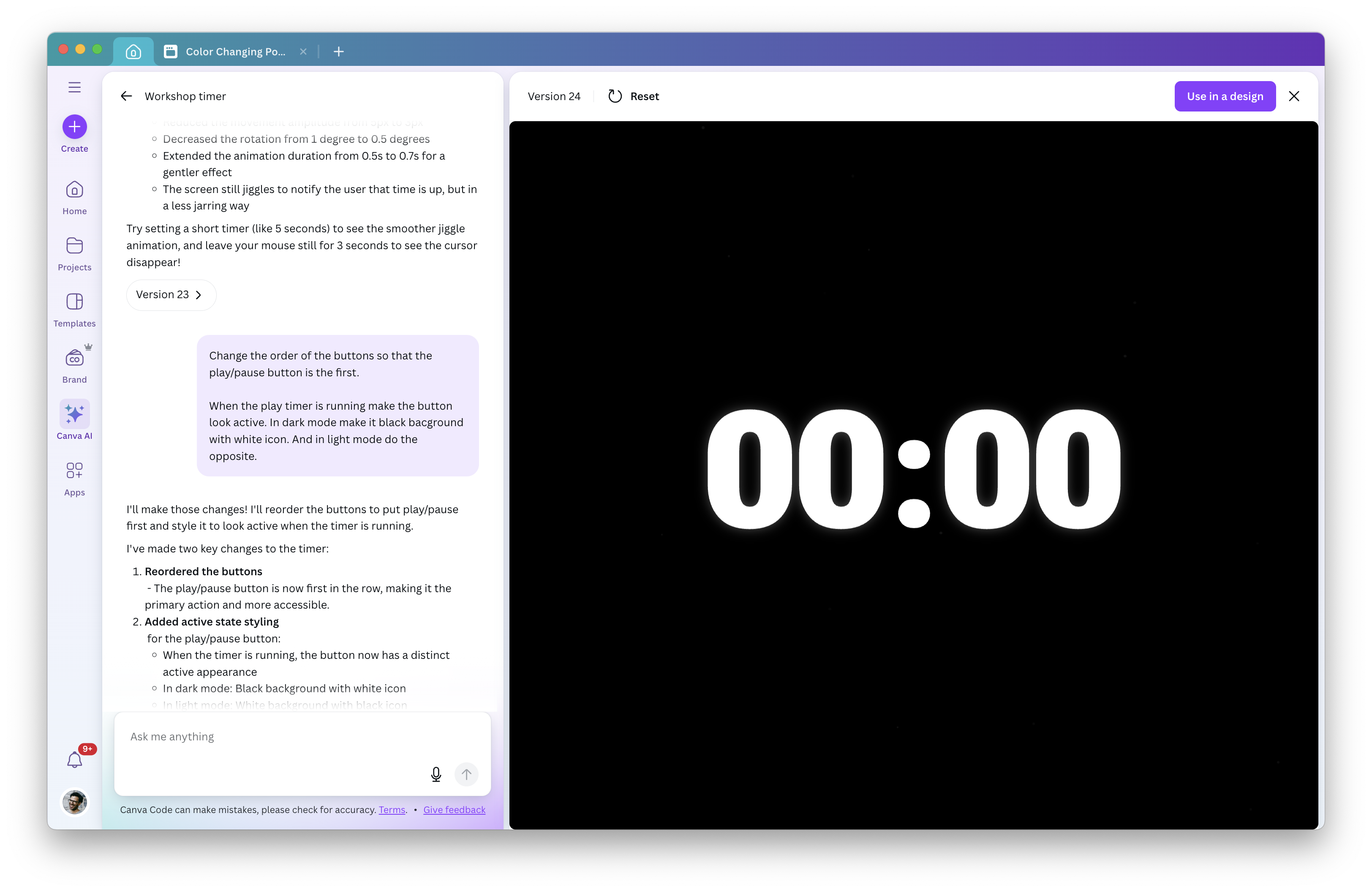 For now it's clear to me that Canva code can create small tiny apps that solve one tiny problem well. Like the city name tool or my timer. Each time similar tools exist, but here you can create tools that fit your own specific version of that problem. Plus you made them yourself, which is always a fun prototyping moment.