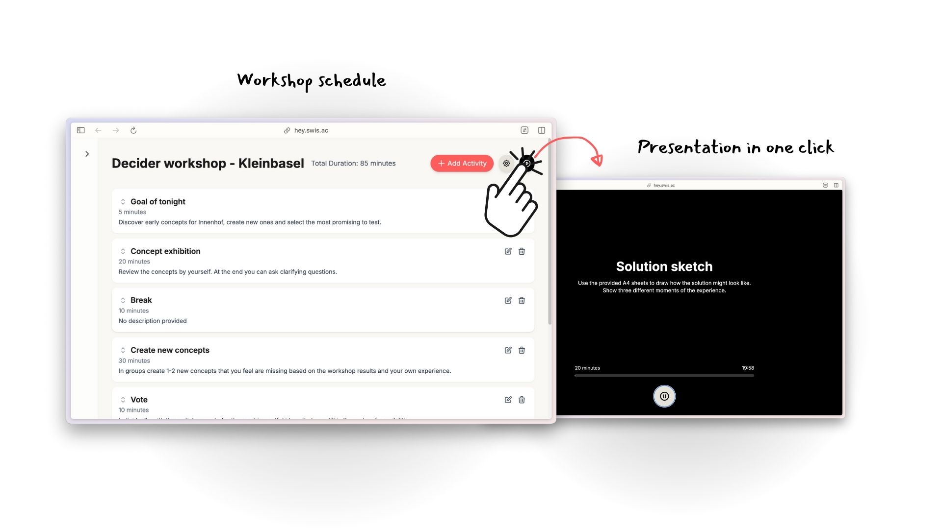 • Let's you build your workshop schedule and easily drag and drop activities at their right place