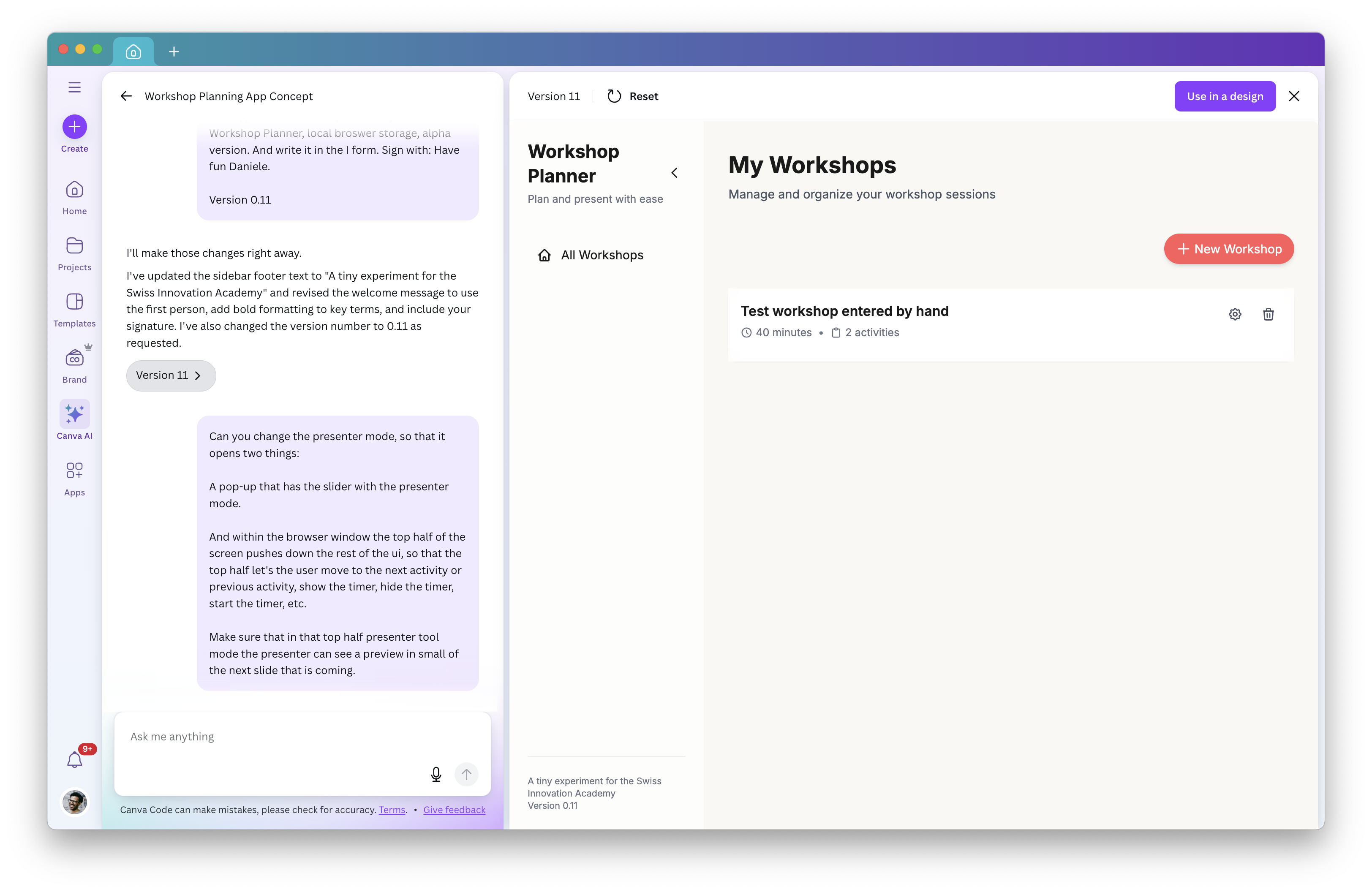 So Canva Code can go pretty far! In fact I created tiny apps that are really strong like having a workshop presenter app that: