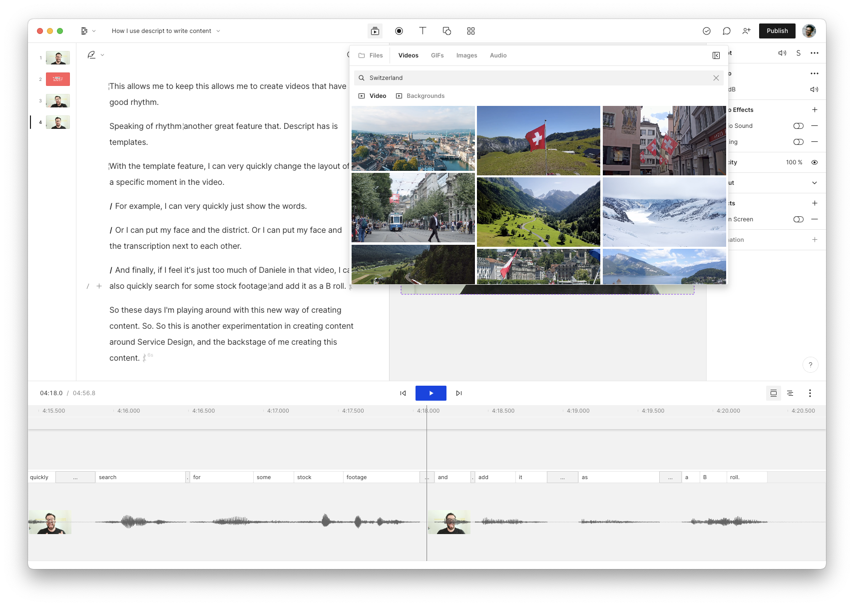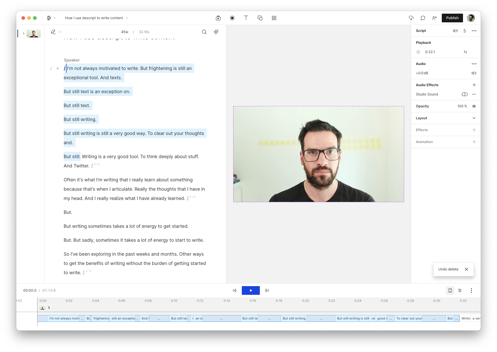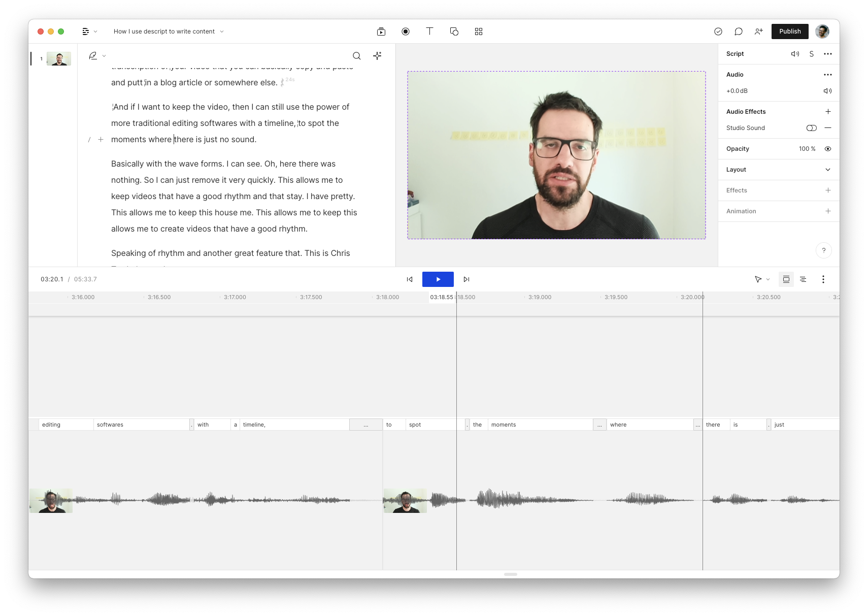 The additional benefit is that Descript gives you a textual transcription of your video that you can basically copy and paste and putt in a blog article or somewhere else.