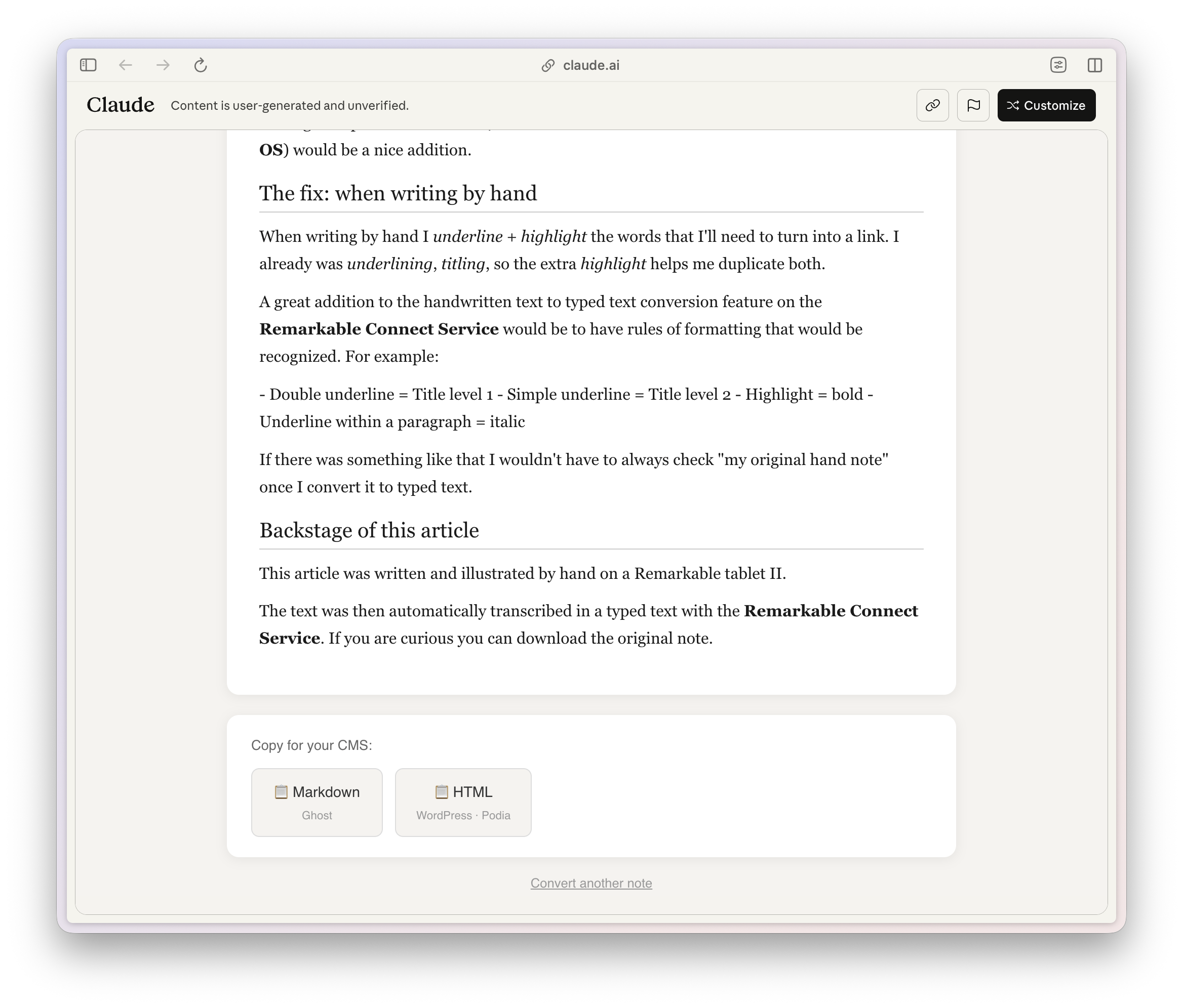 The Remarkable Tablet is great for writing in a focused way as it's a device that does just that and that has no browser. But that also means that there is no possibilities to add links to an article that you are writing. You have to add these links later when you import what you have written in your CMS.