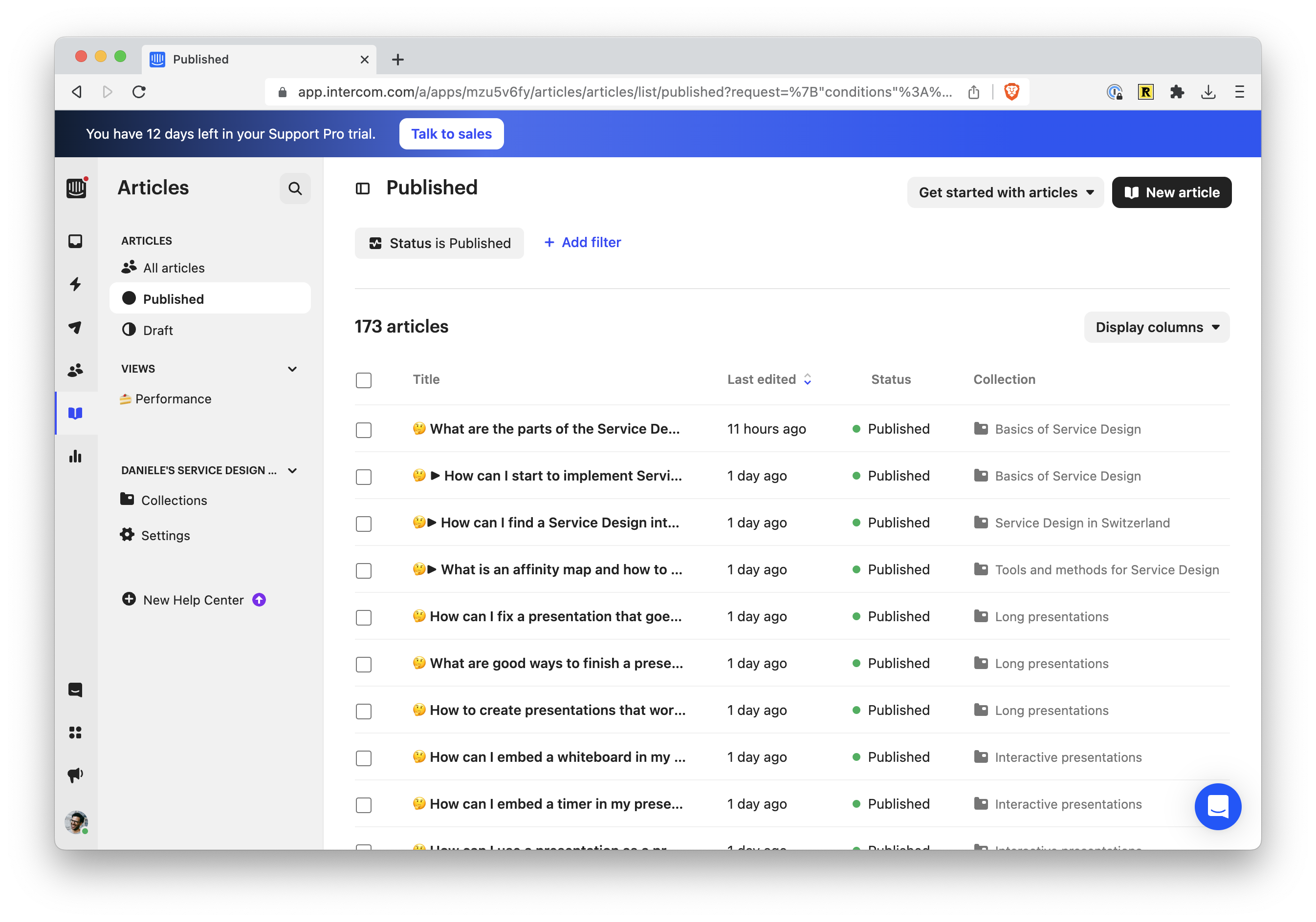 I've already imported 173 articles so far in Intercom, the tool I'll use to run this new project.