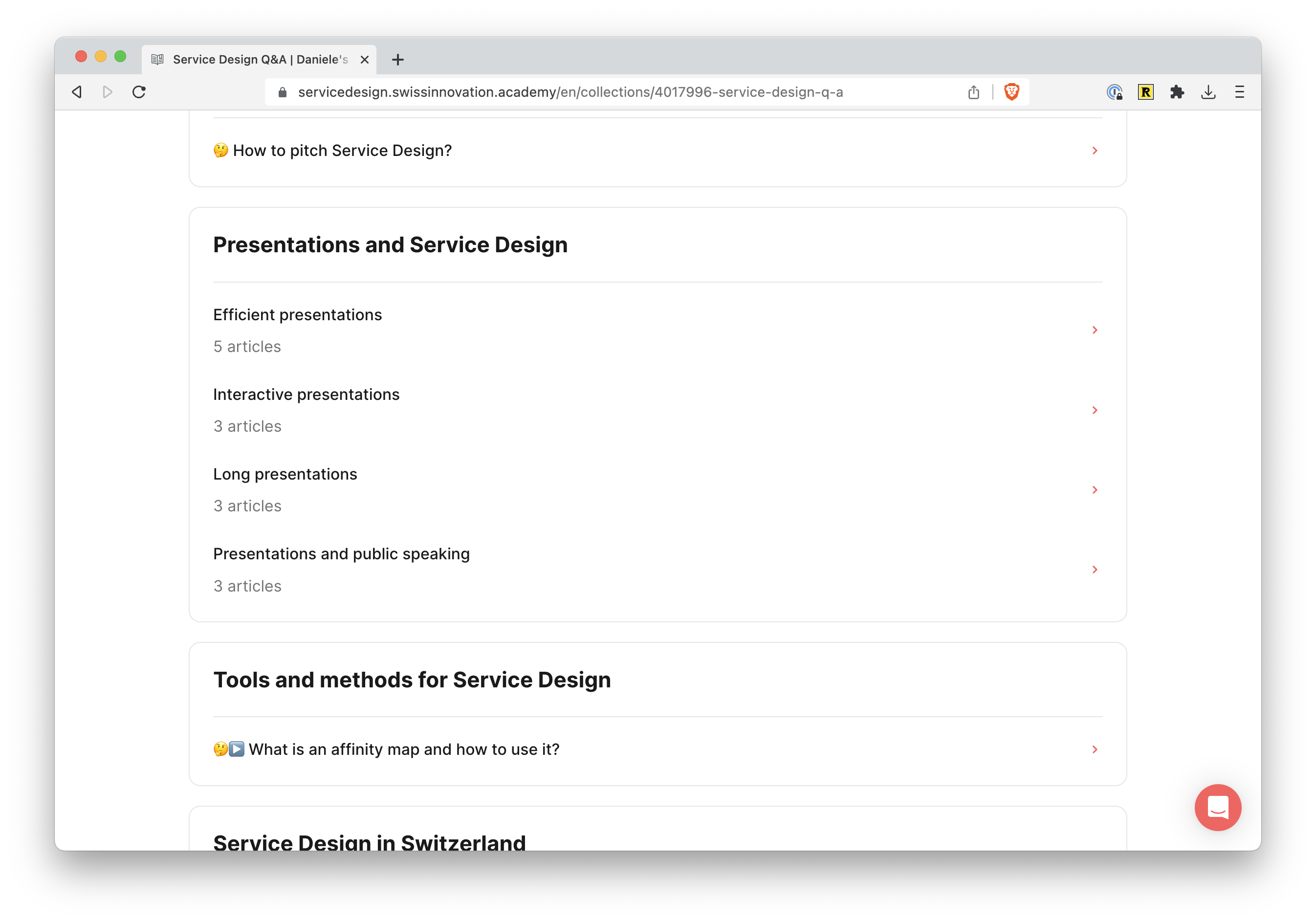 On the Swiss Innovation Academy website I can add the knowledge base in the little chat bubble that is on the bottom right of the screen. So from anywhere people can get an answer to their question.