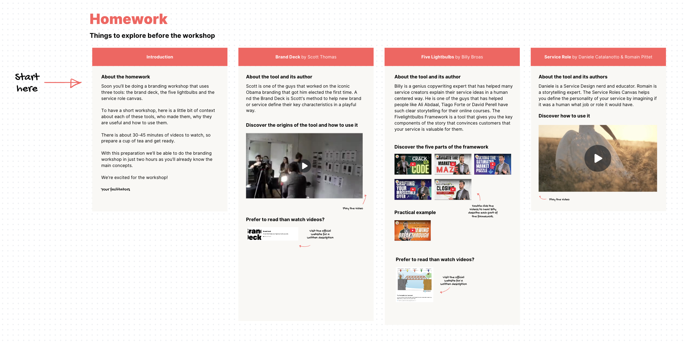 Within the template there is a homework section that you can share with the workshop participants in advance. In it videos for the three key activities of the workshop help the participants understand the activities in advance.