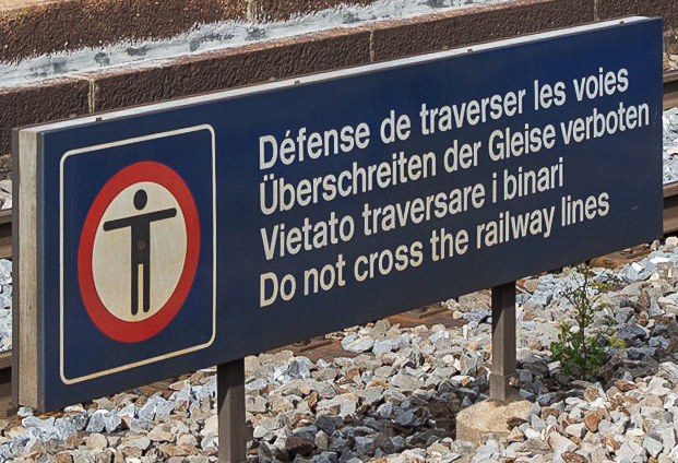 Example of such a sign in multiple languages telling people not to cross the railway lines. Image from Wikipedia