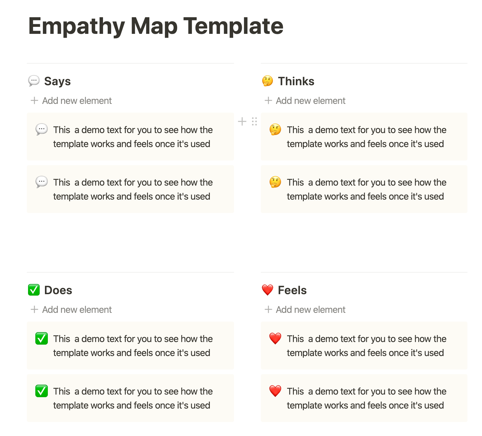 The template uses the classical structure of an empathy map with the four categories showing what the customer says, thinks, does and feels.