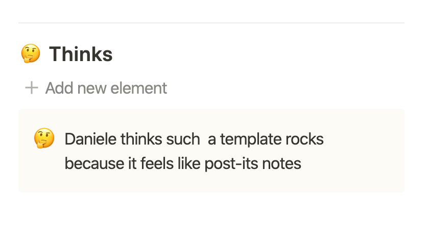 The template uses a sort of of pre-designed type of sticky notes. You can simply add a new element in one click. You get a sticky note with the right color and emoji.
