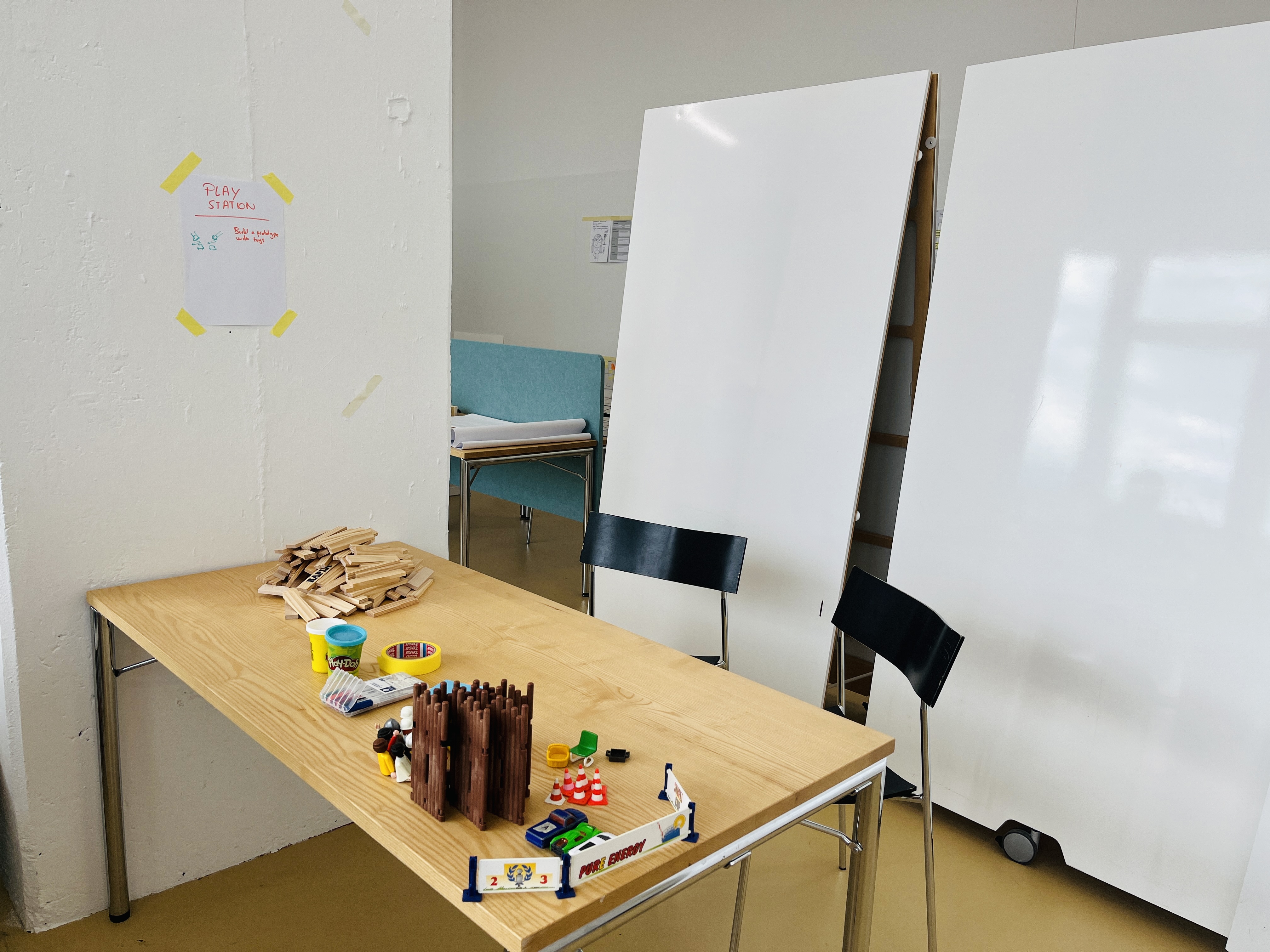In short: sometimes I setup different tables and workspaces with exercises, challenges and materials that learners can use to develop their prototype. Learners can pick and stick to a station or move from one to the other.