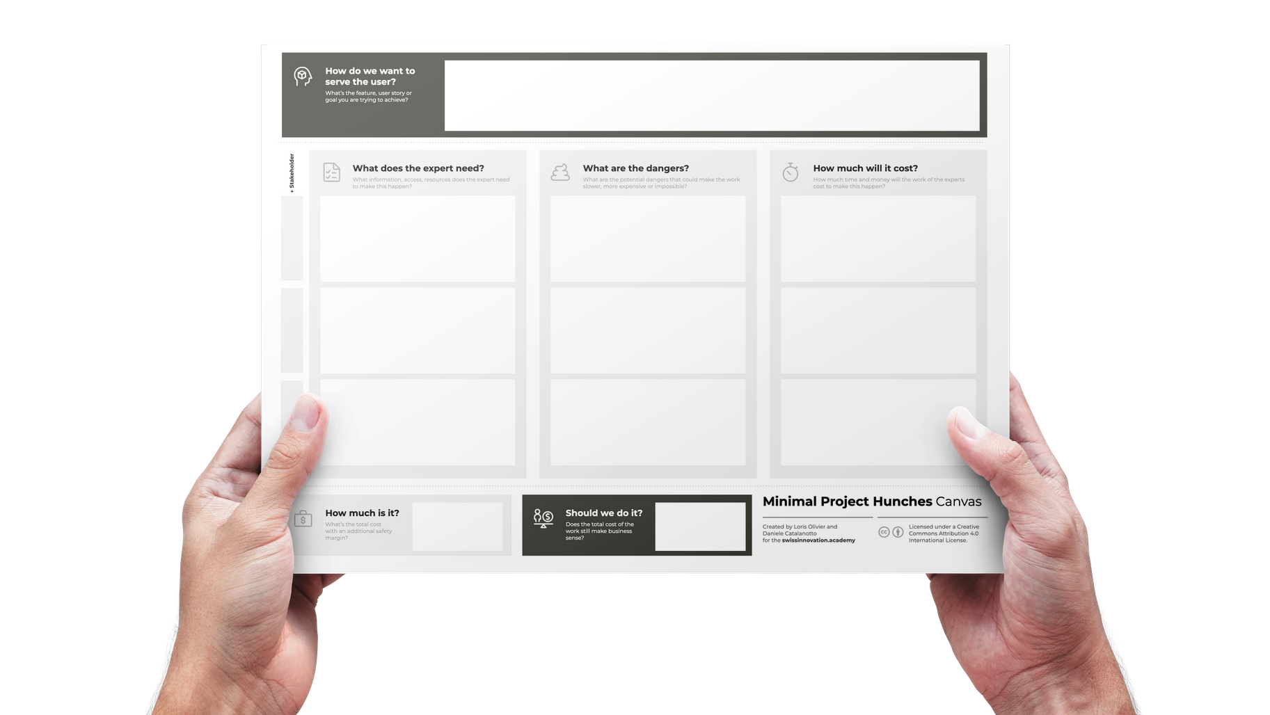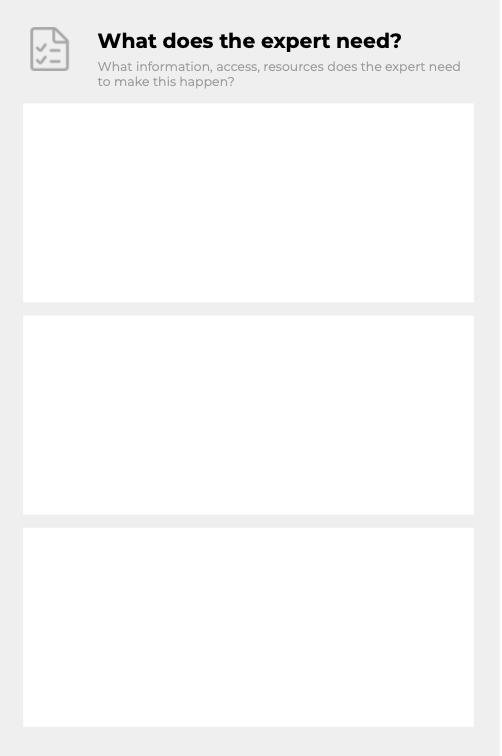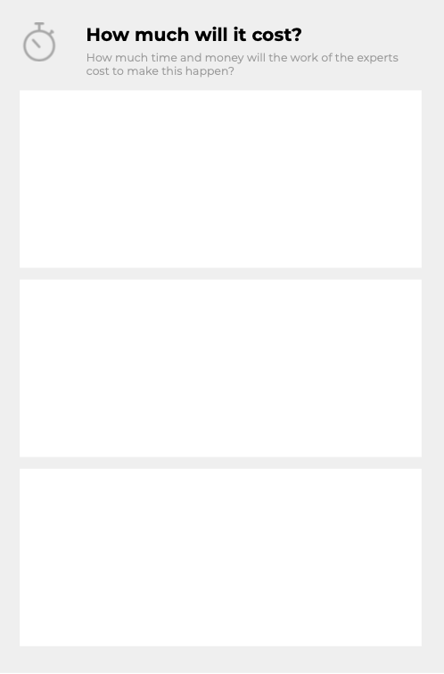 This minimalist template motivates you to ask three key questions to the most important stakeholders involved in your project: What does each expert need? What are the dangers they see? How much will they work cost?