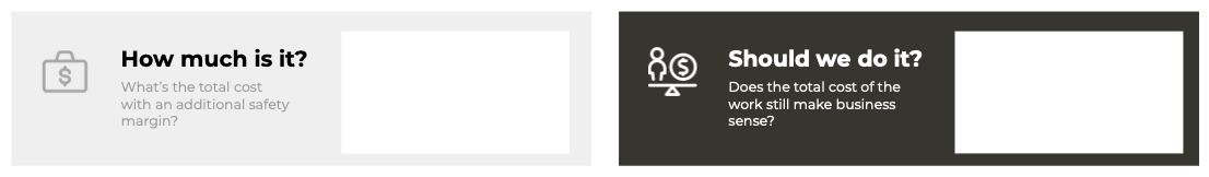 For example it helps you think about each key problem and identify smart alternatives to avoid this issue. Or the template motivates you to speak to 4 stakeholders rather than 3. And finally it adds more granularity in the cost estimation by setting a minimum and maximum.