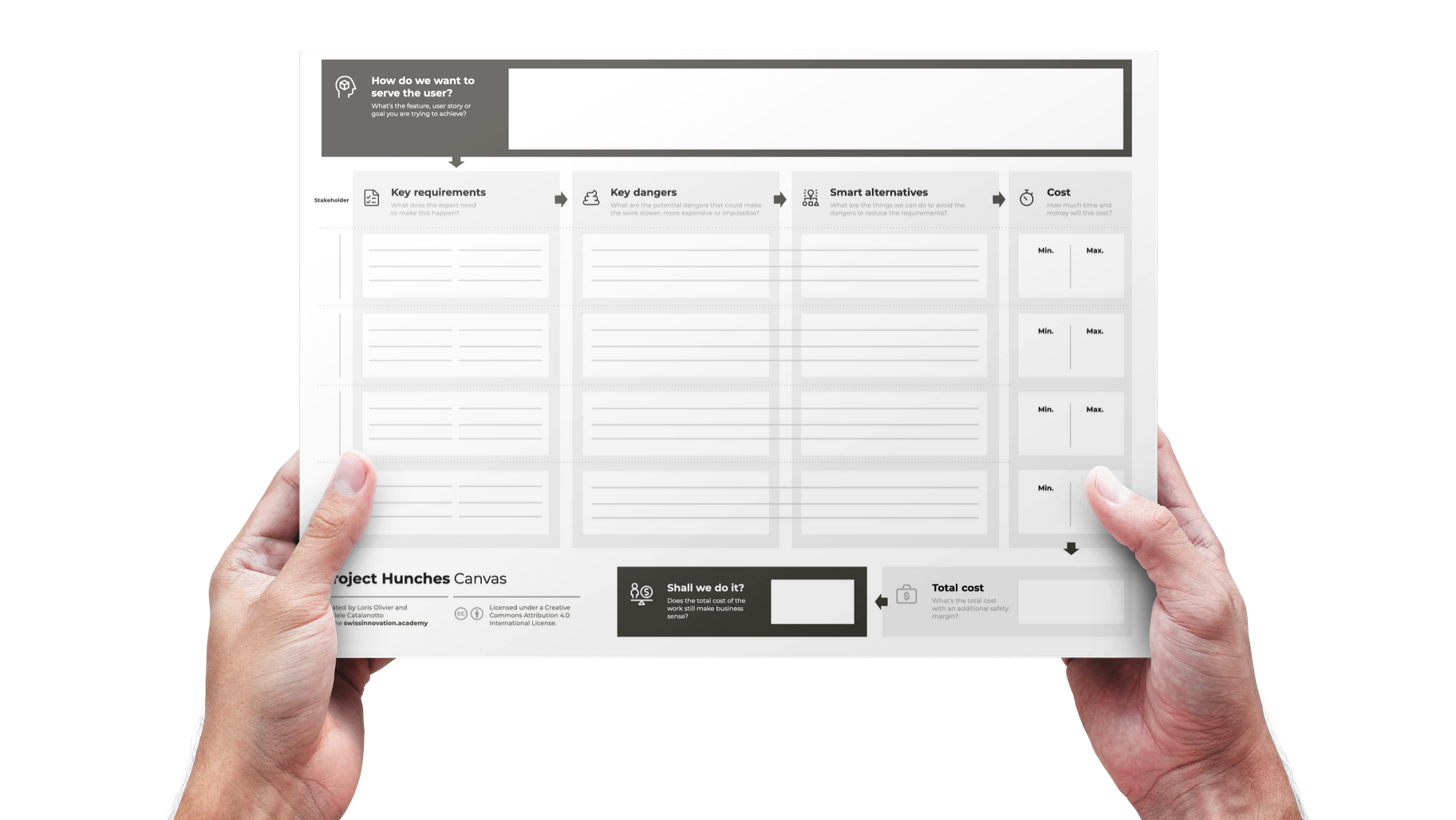 At the end of the canvas you can sum up all the costs provided by each expert or stakeholder. This brings you to the last question: "Should we do it?".