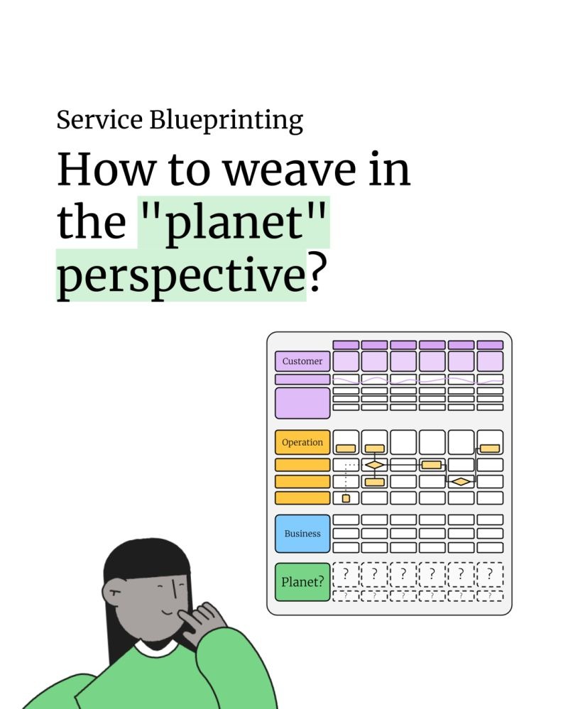 Ben Reason shared on Linkedin a link to an event about Service Blueprinting called "How to weave in the "planet". The image of the event showed a blueprint with a lane for the planet, and I found that particularly inspiring.