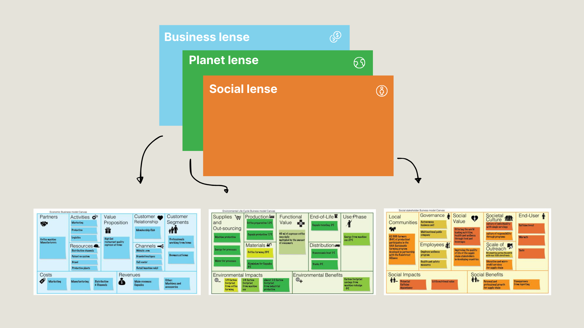 You fill three canvases with three lenses following the original Business Model Canvas structure.